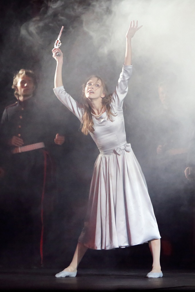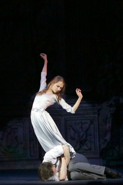 Дальше следует любовный дуэт Гамлета и Офелии, сделанный в лучших традициях Поклитару. Он один умеет создавать такие емкие, выпуклые дуэты-истории, рассказанные от лица конкретных людей. И пары вышли разные: жесткий и прямой как оловянный солдатик Денис Савин из первого состава (именно он, безвестный мальчик из кордебалета стал в 2003 году лучшим исполнителем роли Ромео) получил прозрачную прерафаэлитскую Офелию Анастасии Сташкевич, излучающей жертвенность; а нервическому и страдающему как Петрушка Нижинского Артему Овчаренко досталась витальная ренессансная дева в исполнении Дианы Косыревой, недавнего и очень удачного приобретения Большого театра (балерина громко заявила о себе на последнем Московском конкурсе). Гамлет Овчаренко не в силах оторваться от такой женщины,