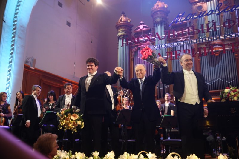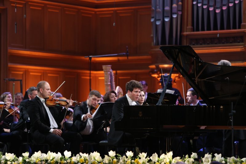 После 27-й симфонии слушатели в зале в течение нескольких минут смогли насладиться высокопрофессиональной и по-своему изящной работой работников сцены Московской консерватории в белых перчатках, которые выверенными движениями устанавливали рояль на сцену, виртуозно лавируя среди оркестрантов. Их место у рояля занял Денис Мацуев, который исполнял Второй фортепианный концерт Щедрина — также одного из любимых Гергиевым автора, который с супругой сидели в зале.