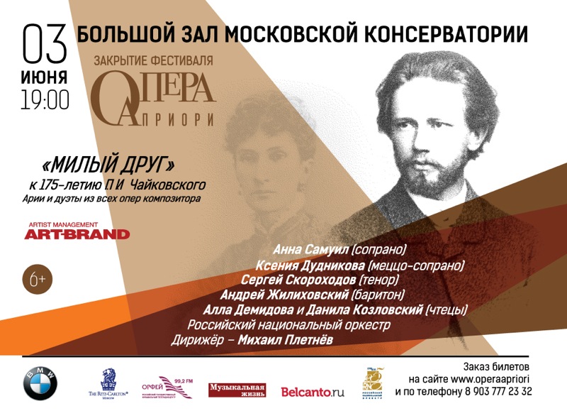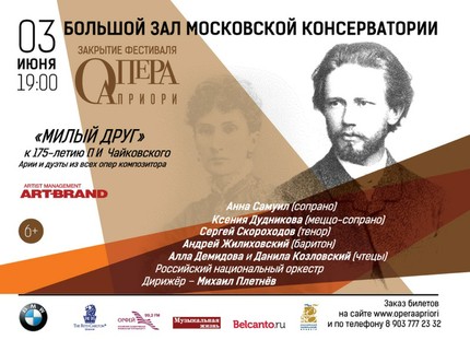«Милый друг» – заключительный концерт II Международного фестиваля вокальной музыки «Опера априори», посвящённый 175-летию со дня рождения П.И. Чайковского, пройдёт в Большом зале Московской государственной консерватории 3 июня 2015 года.