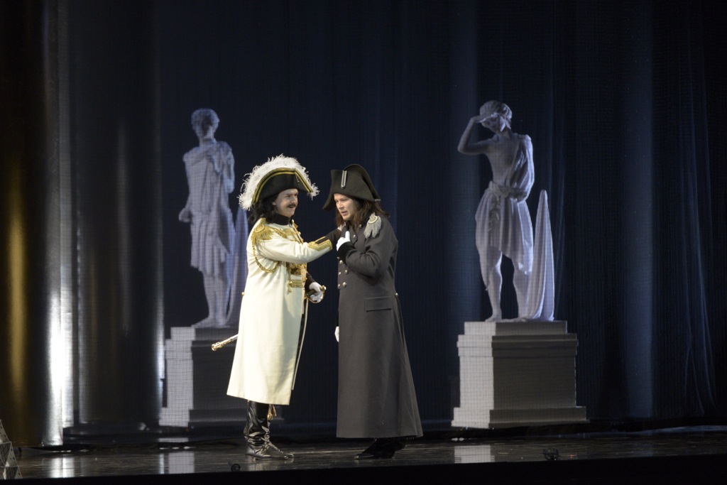 Герой Максима Аксенова неврастеничен, он мечется, все это подчёркивает и пластика, и вокальная выразительность. Уже в сцене первой встречи с Лизой певец достигает высокого эмоционального градуса. Практически весь спектакль он проводит на накале, он сжатая пружина, которая разожмётся только в сцене в своей комнате, когда привидится ему Графиня.
