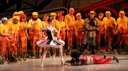 Среди восьми чудес света, демонстрирующих достижения советской культуры в опере «Оранго» — балерина Настя Терпсихорова (Инна Билаш), уверенно исполняющая классические пируэты.