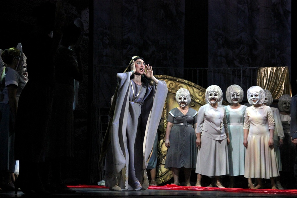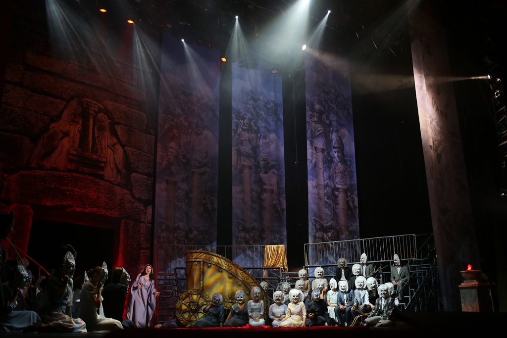 Глядя на сцену из зала, на расставленные амфитеатром трибуны, на живописные, в греческом стиле расписанные задники, на богатый, постоянно меняющийся видеоряд, на потрясающе стилизованные под Древнюю Грецию костюмы главных и второстепенных персонажей, мы легко домысливаем всё, что полагается увидеть в этой опере согласно ее сюжету.