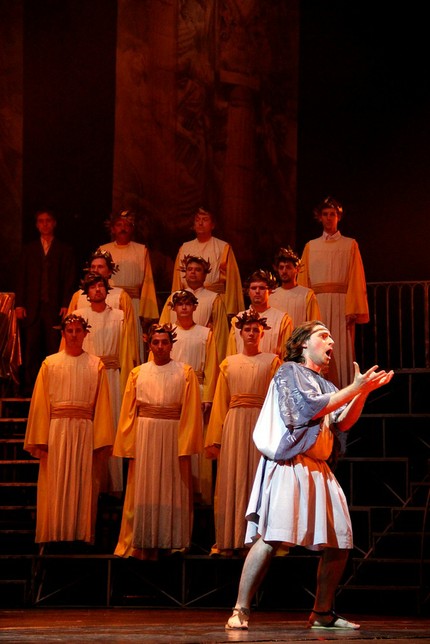 С другой стороны, актуальна и современна, несмотря на то, что все приемы, на которых она прочно зиждется, предстают сугубо традиционными и классическими. Аполлон, появляющийся в самом начале оперы, но начинающий петь лишь ближе к финалу, словно предстает блюстителем справедливого возмездия, оставляя нам свой золотой плащ в качестве символического артефакта, а маленький «мальчик-бог» в золоченой одежде – символом чистоты и непорочности, за которые и ратует Аполлон.