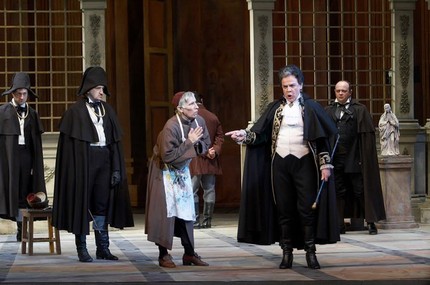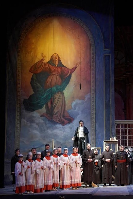 Постановка в целом традиционная: большие классические живописные декорации (церковь, кабинет Скарпиа и площадка башни замка Сант-Анжело), костюмы XIX века. Явное режиссёрское вмешательство чувствуется лишь в трактовке персонажей. Скарпиа вызывает наибольшее количество вопросов.