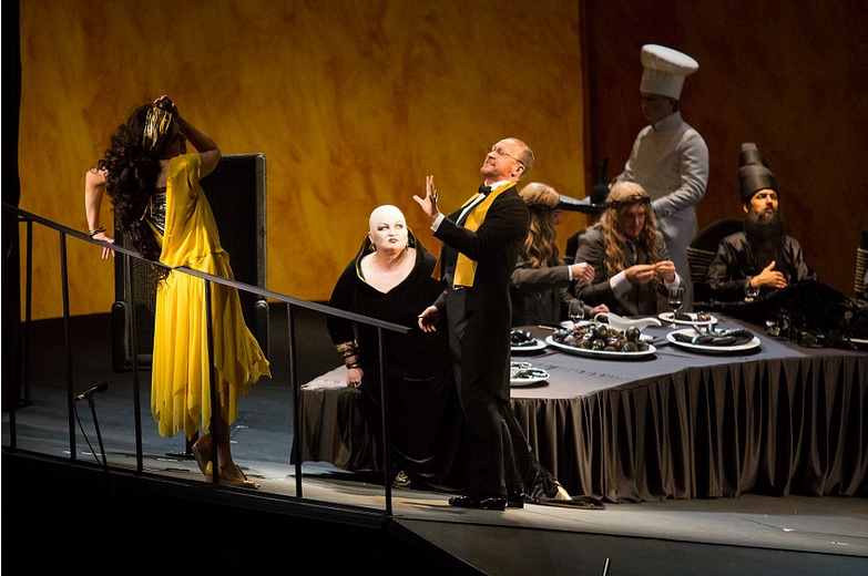 Густые мазки жёлтого задника как будто попали туда из оркестровой ямы Яна Латам-Кёнига, который не скупился на экспрессивные колориты и любовался звуковыми эффектами, уравновешивая их полупрозрачными прикосновениями пианиссимо. Концентратом энергии и могущества стали кульминационные реплики Иоканаана «Ты проклята!» и требование Саломеи отдать голову пророка, когда напряжение атмосферы в зале достигало предела возможного.