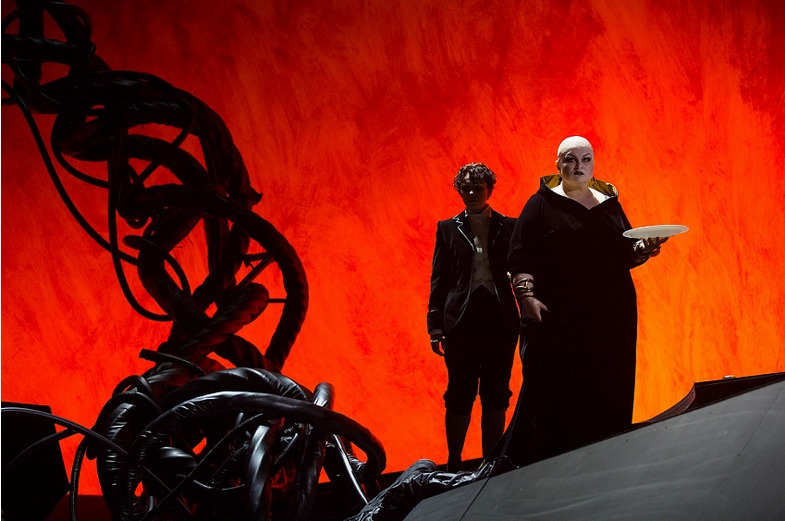 Скрепляет постановку единая ось — образ мирового древа, как будто состоящего из одних могучих корней. Всё рождено из него как метафорически, так и буквально: и спагетти на столе, и плотные кудри Саломеи, и длиннющая коса Иоканаана, и опоясывающие его путы, и, конечно, общее ощущение тугого «нерва». Снайперски точно Этель Иошпа создала атмосферу и единый стиль спектакля, истоки которого прорастают прямо из партитуры Рихарда Штрауса.