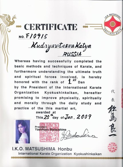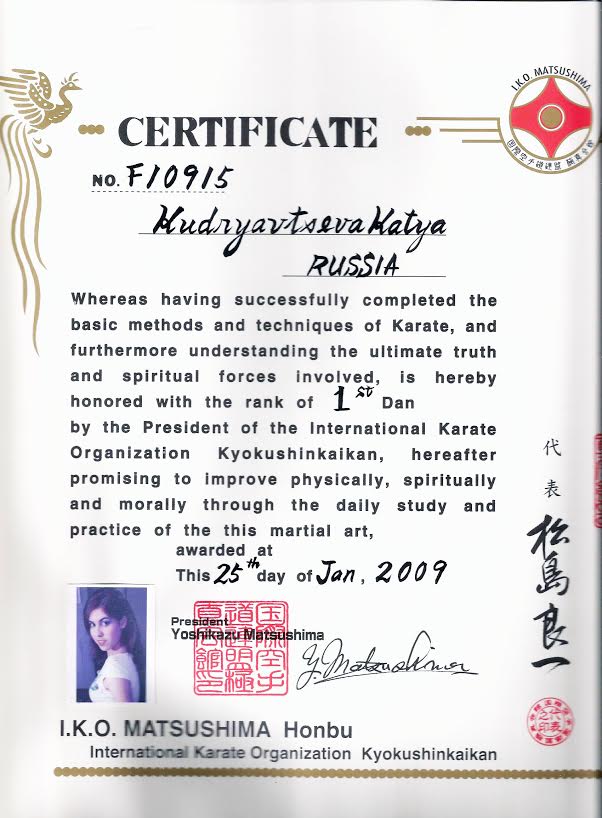 Сразу после театра я пошла на карате. Через три с половиной года получила чёрный пояс. Я научилась разбивать доски и отжиматься на кулаках. Практически каждый день я ездила на тренировки. Бегала под дождём и разбивала кулаки в кровь.