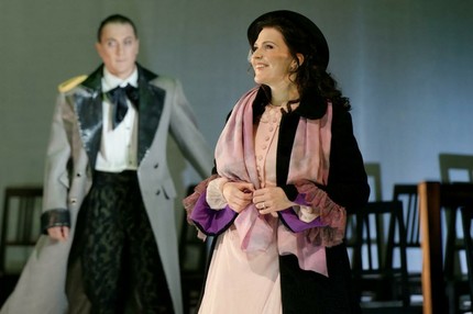 Позже в гавоте Мишкунаите чуть не хватило уверенной вокальной раскованности. Картина же в целом была восхитительна: мир куртизанок, где поначалу всё кажется несерьёзной игрой, предстал во всей своей прелести. Небо залили зелёным цветом, под потолком слегка покачивались букеты из разноцветных воздушных шариков.