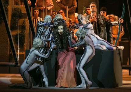 Появление Эриний непримечательно — во втором действии они возникают в задней части сцены, практически невидимые, как тени, далее их и вовсе загораживает хор. Зато потом Медея не знает, куда от них деваться — до конца оперы они будут виться вокруг неё, постоянно двигаясь и порядком надоедая не только певице, но и зрителям. Из-за этого изначально хорошая идея превращается в нечто навязанное и чересчур растиражированное, а также противоречащее заявлению самого режиссёра о том, что все злодеяния Медея совершает из-за сильной любви.