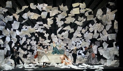 Посреди абстрактного помещения, оклеенного листами из партитуры, стояла кровать. Персонажи то копошились в этой кровати, то в избыточном количестве суетились на сцене в путающихся под ногами бумагах, производя множество мелких действий, которые тем не менее не позволяли проследить логику каждой картины в частности и сюжета в целом.