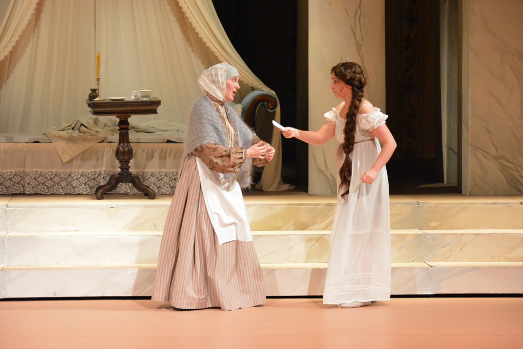 Ольга (Ирина Рейнард) – то рьяно прыгает, отбирая книгу у Татьяны, как бы играя и шутя, то впадает в странную истерику с капризным дерганьем ног в конце сцены бала. Ребенком все зовут ее не зря, но только выглядит это всё нелепо и неестественно.