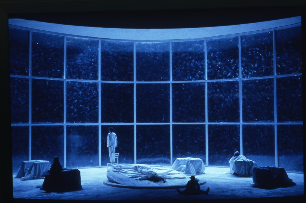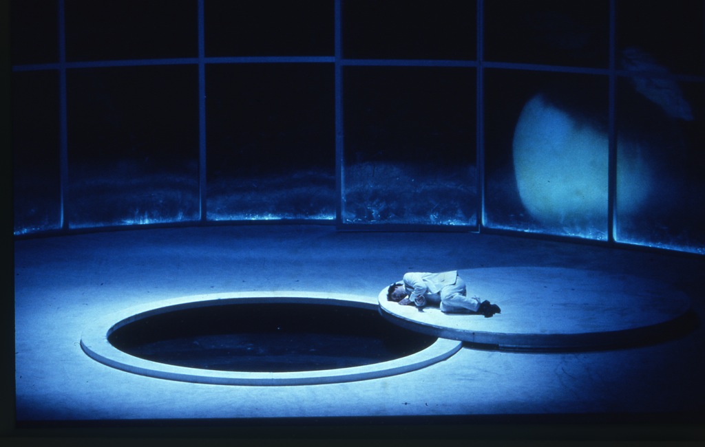Королевство Аллемонда оказалось абстрактным стерилизованным пространством, то больнично-белым, то подсвеченным другими цветами. Посреди сцены — черная круглая дыра. В первой картине «Лес. У источника» казалось, будто Мелизанда сидит зимой у проруби, завернувшись в простыню.