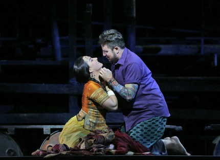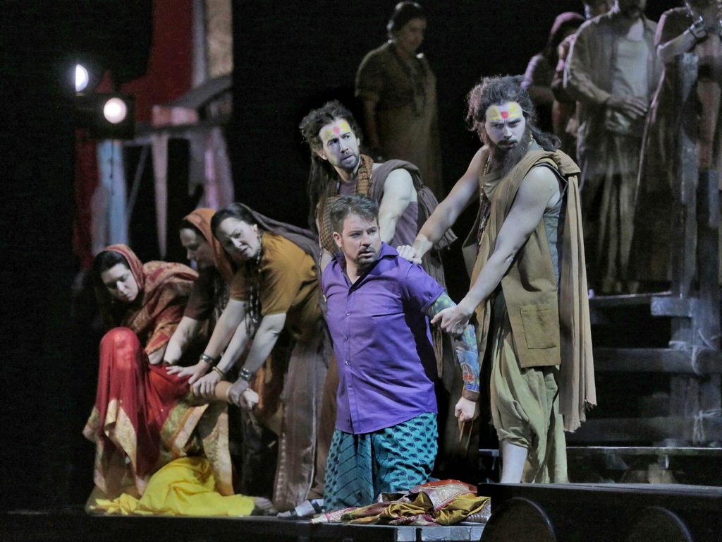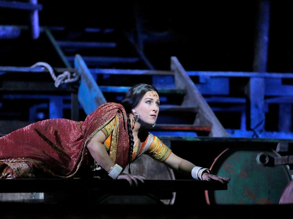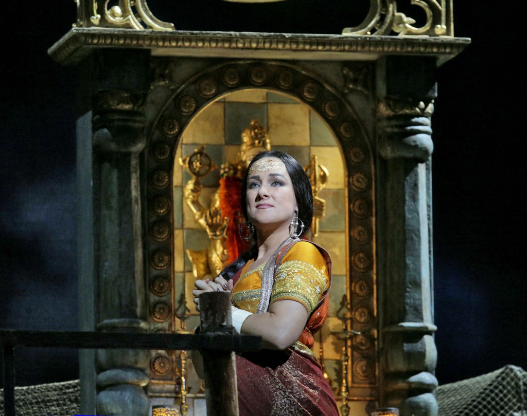 Впрочем, хор и оркестр под управлением маэстро Джанандреа Нозеды абсолютно никаких нареканий на свой счет не вызвали: всё было очень профессионально и добротно. Другое дело, что и особого растворения в этих пленительных звучностях достичь также не удалось по причине стилистического несоответствия им самóй театральной «картинки». Певцы же – особая статья разговора. С самым первым появлением немецкой сопрано Дианы Дамрау в партии Лейлы сразу же стало понятно: перед нами – не хрупкая и беззащитная индуистская жрица, а самая настоящая Брунгильда, просто мощная, как говорится, «девушка с веслом». Певица всегда специализировалась на лирическом репертуаре, в том числе и на колоратурных партиях, и на ролях бельканто, но типично немецкая постановка голоса и холодно-педантичная манера звукоизвлечения, несмотря на известное мастерство исполнительницы в плане виртуозности и фразировки, возможности по-настоящему плениться ее героинями никогда не давали. Так вышло и на сей раз: вокальный механицизм, а иногда и жесткая напористость уступали место живой теплоте настоящего чувства.