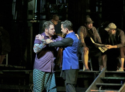 В предпоследней картине трущобы сменяются «офисом» приказчика Зурги, управляющего всей артелью. Время от времени все эти выгородки скрываются за видеопроекционным полупрозрачным экраном, на котором бушует водная стихия, а с помощью акробатов, опускаемых и поднимаемых на тросах за этим занавесом, создается эффект погружения ловцов в океан. Да – эффектно! Да – красиво! Но это вовсе не то, за что надо бороться в лирической французской опере, превращая ее в банальный мюзикл. В спектакле Английской национальной оперы, в которой все без исключения постановки идут в переводе на английский язык, по-видимому, весь этот привнесенный, надуманный антураж выглядел куда более органично, но вербальная французская составляющая нынешней постановки, которая сама по себе всегда воспринимается уже как музыка, этому явно чужда.