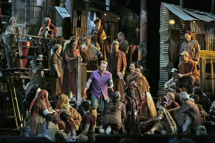 Идейная эстетика нынешней постановки – цветасто-пестрое индийское кино в жанре костюмной мелодрамы, некогда безумно популярной в нашей стране. «Снято» это кино в интерьерах типичных трущоб Бомбея или Калькутты, и предстает скорее англо-американским мюзиклом, непривычно звучащим под лирически проникновенную музыку Бизе, – мюзиклом, которому свойственны черты нарочито отталкивающей современной реальности, довольно проблемно воспринимающейся в контексте оригинального либретто и оригинальной партитуры. Основные сценические конструкции спектакля – серые деревянные «вехи, похожие на планировку» – прямо по Гоголю, если вспомнить указания паникующего городничего в «Ревизоре»! Они даже способны раздвигаться, чтобы создавать «водный» простор, по которому прибывает лодка с новой жрицей Лейлой, в обязанность которой как раз и входит отвлекать злых духов во время опасной работы ловцов жемчуга.