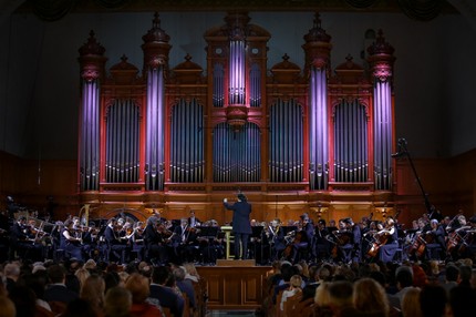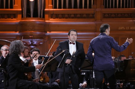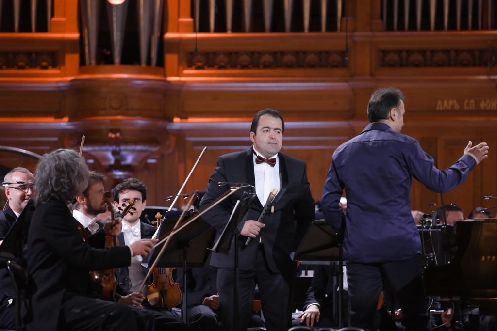 Совсем иное звучание инструмента — в Рапсодии для фортепиано с оркестром (к 110-летию со дня рождения Арама Хачатуряна). Само по себе произведение — очень визуальное, почти кинематографичное, благодаря сменяющим друг друга ярко контрастным разделам. А еще, оно было единственным в этот вечер с едва уловимой, но скорбной интонацией. Может быть, тому виной дудук (соло Хачатура Саркисянца), в котором таится врожденная меланхолия, непреодолимая печаль целых поколений. Может быть, напряженная, неистовая середина, сменяющаяся картиной ликующего шествия, но затем неизбежно возвращающаяся к отрешенной грусти. Вазген Вартанян, колдующий за роялем, удивительным образом сумел трансформировать звук клавиш. Перед публикой калейдоскопом пронеслись небесный перезвон колокольчиков, рокот рвущейся наружу раскаленной лавы, россыпь самых разнообразных «ударностей», торжество колоколов, нарочито открытый, как бы «народный» тембр, задумчивый трогательный напев… В руках пианиста инструмент сам по себе был оркестром в миниатюре.