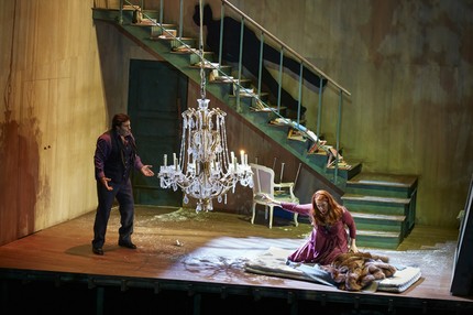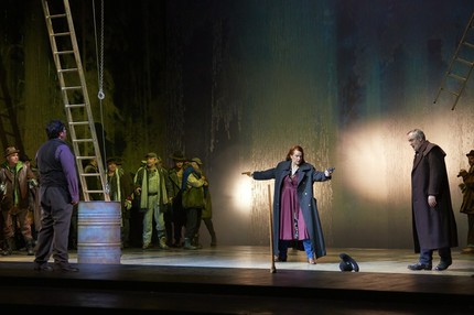 В режиссуре Винсента Буссарда только один эпизод нарушает классическое течение действия. Ностальгическую песню «О мой дом, рядом с берегом… ты далеко… кто тебя увидит?» поёт трансвестит в белом парике под неоновой вывеской (молодой российский бас Станислав Сергеев). Этим ходом режиссёр включает постановку в контекст города, и, одновременно, втягивает город в пространство спектакля.