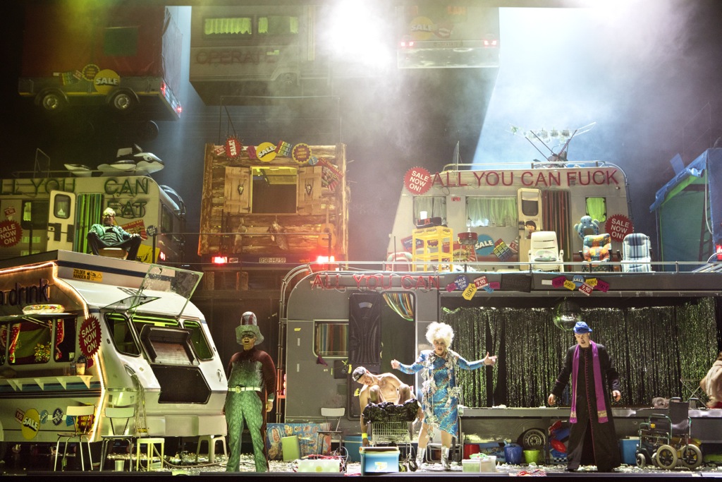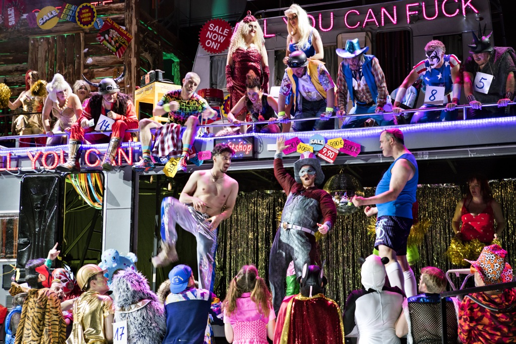 Говоря о серьезном на языке комикса, спектакль Биейто остросоциальную подоплеку, хотя де-юре она в нем присутствует, де-факто теряет. Эпатаж Биейто применительно к щекотливой теме, заданной Брехтом – Вайлем, неожиданно предстает чередой визуально-провокационных, но очень ярких вариаций. Возобновление этого сезона пытается идти и в ногу со временем, и кризис в Махагони (один из эпизодов оперы) даже робко переносит на нынешний кризис в Европе, связанный с недавним «Брекситом» – референдумом в Великобритании, сказавшим «да» выходу страны их Европейского союза. Так случилось, что состоялся он 23 июня, то есть накануне первого спектакля антверпенской серии: с 24 июня по 5 июля прошли 6 представлений, и автору этих строк удалось посетить 4-е и 5-е.