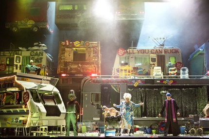 Удивительно, но та постановка, несмотря на существенно меньшую степень визуального натуралистического эпатажа и более сдержанный по сравнению с почерком Биейто характер, оставила впечатление тягостной гадливости и полной постановочной беспомощности. Но нынешнее возобновление постановки в Антверпене в ее оригинальной немецкоязычной редакции даже при обилии в ней обнаженной натуры (как женской, так и мужской!), даже при наличии еще более недвусмысленных грязных намеков производит впечатление единой «праздничной» феерии, номерного яркого мюзикла, жанровая природа которого, в сущности, еще более условна, чем оперная. Реалистично-кровавая драма персонажей проходит через ряд человеческих потерь, но мы словно внимаем спектаклю-шоу, спектаклю-ревю: серьезные глубинные корни социального конфликта спрятаны в нем за оболочкой феерически выстроенного визуального ряда.