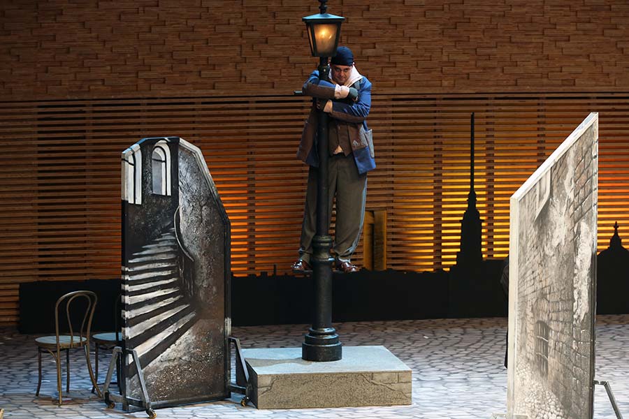 Сценография лаконична, сцена практически все время пребывает в темных тонах. Обилие венских стульев, двери и окна, вынесенные на середину, в определенные моменты они как-то лихорадочно вращаются. Игра света и тени героев убийственна и завораживающа.