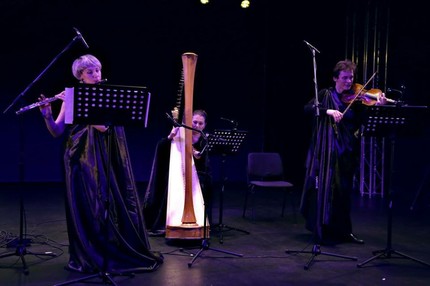 Исполнители произведения Кевина Эрнста «Numina» (а их было трое: Наталья Береславцева, Татьяна Осколкова и Сергей Полтавский) воспроизвели некую аллегорию обряда отречения от сатаны. Сценический «дресс-код» — черные балахоны, краткое содержание действа — грозные реплики на латыни: «Abrenuntia? – Abrenuntio!» («Отрекаешься? – Отрекаюсь!»), несчастная жертва — арфа, которую сии жрецы искусства картинно и изящно пилили альтовым смычком. Слабонервные, вздохните спокойно! Арфа осталась в целости и сохранности, но само выступление действительно впечатлило.