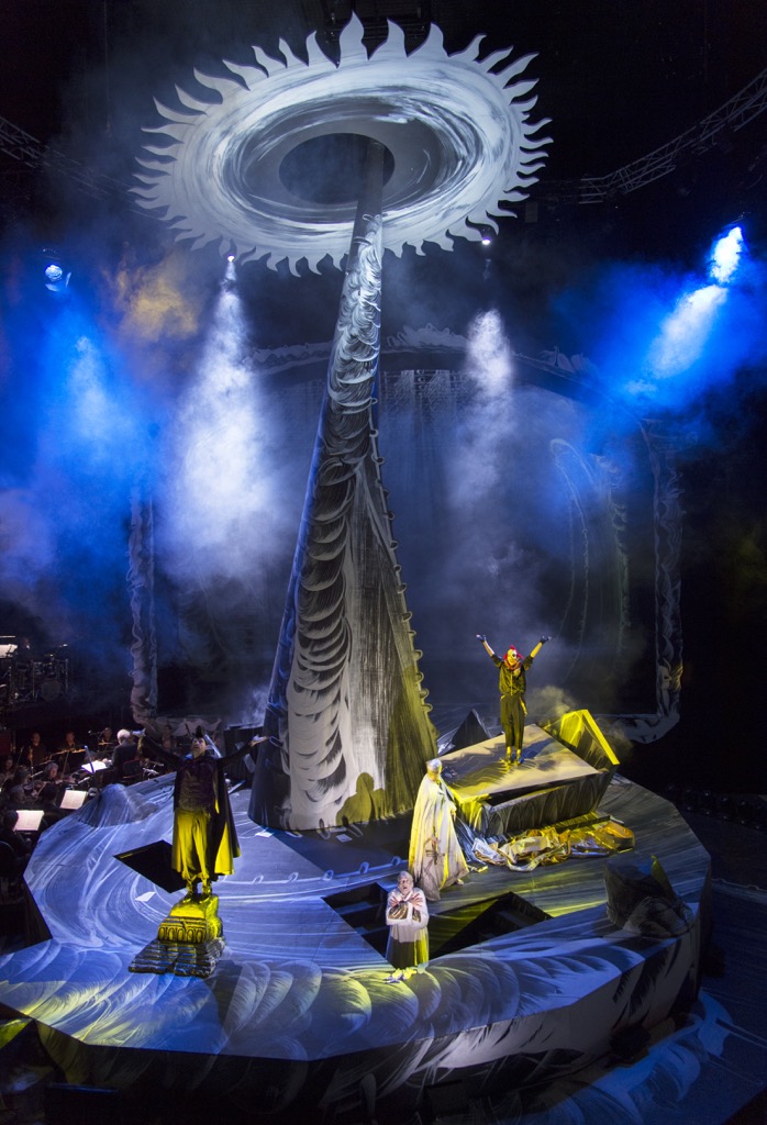 поэтому архитектурные особенности театра были использованы по максимуму. Из центральной части зала, которая находится в круге бывшей арены, были убраны кресла, а на их месте сооружен огромный помост-сцена, выступающий в зрительный зал. Сама же сценическая коробка закрыта полупрозрачным экраном, на котором по ходу действия демонстрируется мрачный анимационный видеоряд в фирменном стиле Куэй. Центр сцены занимает грандиозная фантасмагорическая конструкция, напоминающая некий смерч или черную дыру, затягивающую в себя весь мир.