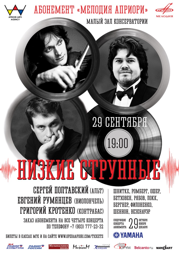 Первый концерт серии «Мелодия априори» представляет четыре трио, три дуэта и три сольных пьесы «в дуэте» с электроникой — программу для нетривиального ансамбля «низких струнных» — альта, виолончели и контрабаса. В XVIII веке эти инструменты не считались сольными, но с тех пор ситуация кардинальным образом изменилась, особенно в ХХ веке. В концерте прозвучат произведения от эпохи барокко до XXI века, а музыкальный материал программы столь же необычен и редок, как и сам состав ансамбля.