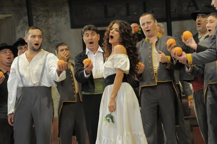 После увертюры открывается занавес, и перед зрителем предстают одушевлённые картины испанской Севильи — выгоревшие на солнце стены домов, телега со спелыми апельсинами, махос с бандитскими навахами за пазухой, оборванная детвора, курящие красотки-табачницы, продевающие «сквозь оконные перила» бронзовые от загара ножки.