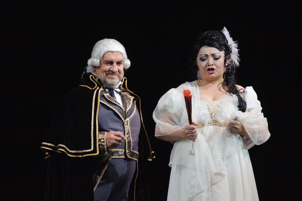 в роли певицы Флории Тоски солистка казахстанской «Астана-Опера» Жупар Габдуллина, партию романтичного художника Марио Каварадосси исполнил Георг Ониани — солист Театра Бонна (Германия), а в роли зловещего барона Скарпиа предстал солист Мариинского театра Александр Никитин. Все трое продемонстрировали сфокусированное, гармоничное и резонирующее с персонажами звучание. Знаменитая ария Каварадосси «E lucevan le stelle» как будто заполнила собой весь зал без остатка. Думается, у многих зрителей во время спектакля возникло ощущение, что они в настоящей итальянской опере.