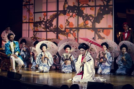 Проекционные панели-экраны как основной сценографический элемент образуют несплошную разделительную полосу-завесу. За ней на заднем плане располагается оркестр, а довольно большой полукруг сцены перед ней отдан действию. Над полосой постоянно перемещаемых вертикальных панелей в качестве верхнего яруса возвышается большой горизонтальный экран, и на него также проецируются картинки-настроения из цикла зарисовок экзотических видов восточноазиатской природы. И что очень важно, каждый персонаж-участник этого проекта – от главных героев до второстепенных – в живых и увлекательных режиссерских мизансценах предстает неотъемлемым сюжетным звеном. Из этих звеньев слагается театрально-зрелищное целое. В основе его восточноазиатского аромата – изысканная утонченность сценографического антуража, в котором все занятые в постановке артисты лицедействует весьма увлеченно и самозабвенно.