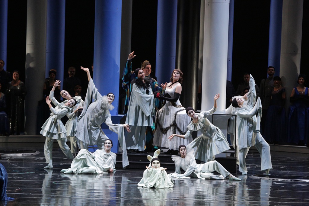 В эпицентре этого рокового числа три центральные колонны, где у двух будто подрезаны золотые верхушки. Впрочем, обращение гостей бала к пустой царской ложе во время знаменитого гимна «Славься сим Екатерина» — вероятно, знак того же калибра. В итоге, последний хор «Господь! Прости ему! И успокой его мятежную и измученную душу» — звучит как отпевание не Герману, а миру Петербурга.