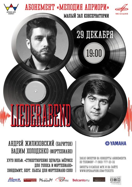 Заключительный концерт серии «Мелодия априори» представит редко звучащие песни австрийского композитора Гуго Вольфа на стихи Эдуарда Мёрике в исполнении двух известных артистов, чьи международные карьеры развиваются едва ли не успешней, чем в России — ведущего солиста Большого театра Андрея Жилиховского (баритон) и победителя XIV Международного конкурса им. Вана Клиберна, выпускника Московской консерватории, пианиста Вадима Холоденко.