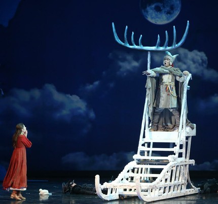 Еще одна деталь — традиционные лапландские сани, на них появляется Снежная королева (очаровательная обладательница сильного голоса Анна Кикнадзе). На таких санях Маленькая разбойница (Регина Рустамова, создавшая очень неоднозначный образ) провожает Герду (Анастасия Донец) на поиски Кая.