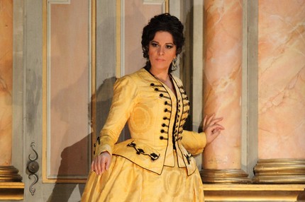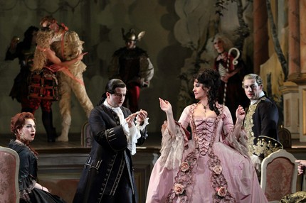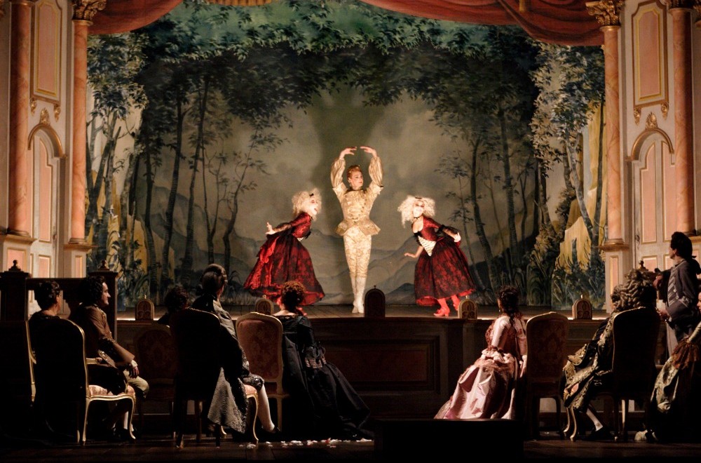 Кажется, что ты во французском театрике времен Людовика XV, когда на сцене ставили трагедии Расина. Сказочные костюмы Бриджитт Рейффенстуэль только дополняют этот эффект, а балет XVIII века — манерный, примитивный — воспринимается сегодня как абсолютный архаизм и трогательная пародия, однако очень эффектно убеждает нас в реальности происходящего.