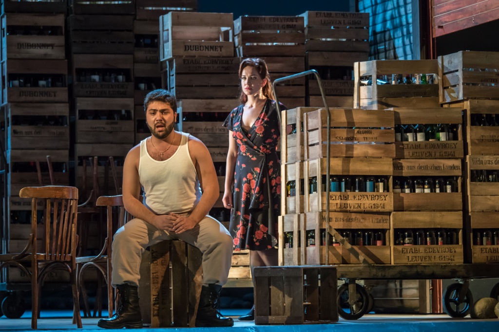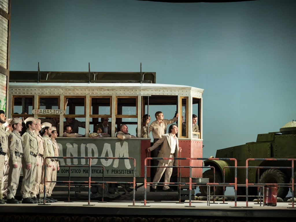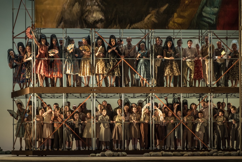Не всё так просто. На сцене в первом действии стоит броневик. Работницы табачной фабрики прогуливаются в легких одеяниях выше колен; здесь соседствуют жара и мятежность духа. В лагере контрабандистов – военный грузовик и подготовка оружия, потасовки с размахиванием навах. В финале испанки в «рогатых» мантильях на трибунах радостно отмечают праздник, а те самые контрабандисты с чемоданами уходят разбираться с делами, и какими — может, лучше и не знать.