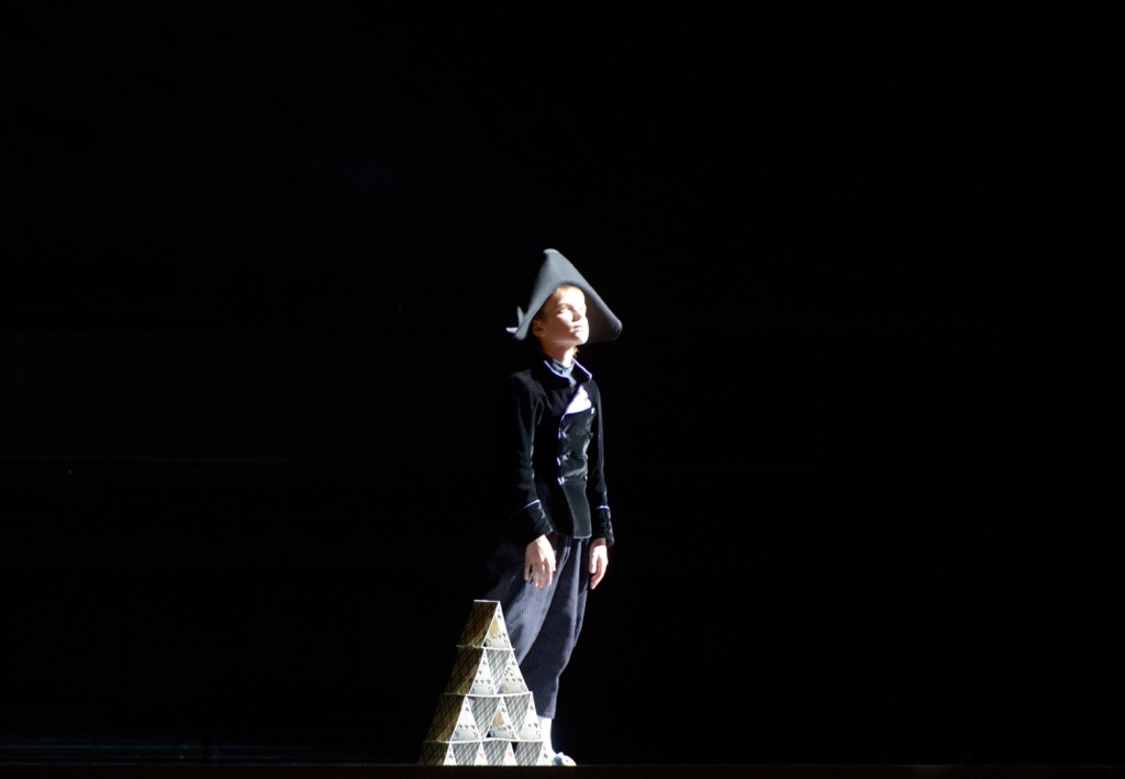 Мальчик (Егор Максимов) начинает спектакль — с какой-то полуулыбки, с трепета ресниц. И, как всегда бывает в спектаклях Алексея Степанюка, дальнейшее развитие истории словно выплывает из тумана. Через блики, через золотые движущиеся колонны, через траурный тюль, через него выглядывает иногда Герман… Выглядывает Судьба.
