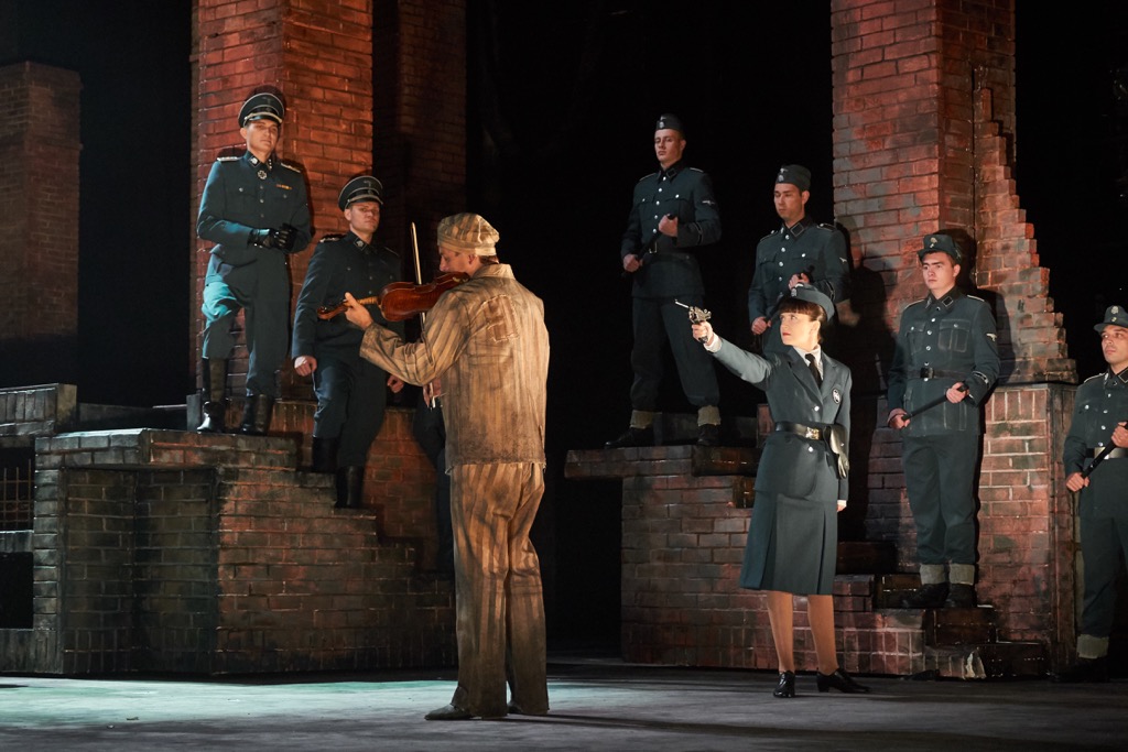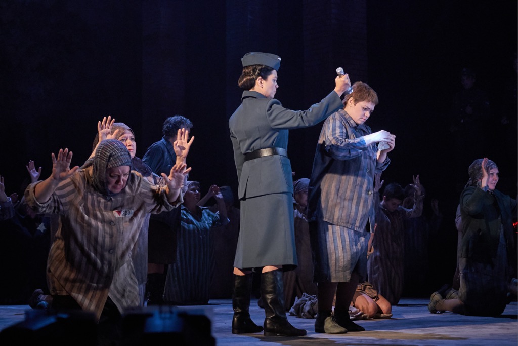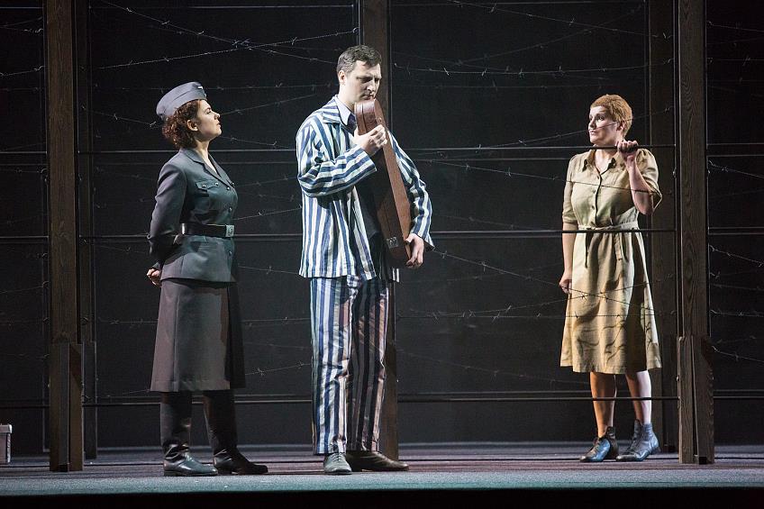 (обилие кинокадров с крупными планами героев, с диким лаем собак, обнаженные заключенные, нарочито «кровавый расстрел» жениха Марты – Тадеуша) и злоупотреблением прямыми ассоциациями (кадры березок во время русской акапельной песни заключенной). Это, в общем-то, справедливо, но сам принцип кадровости дает и положительный эффект — динамичность действия и полифоничность развития. Этому соответствует и выбор либретто на разных языках, сделанный для первого спектакля в Брегенце. Четко разграничены национальности (немецкий, английский, русский, французский и польский) и места действий (корабль и лагерь).