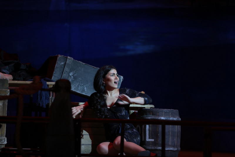 Сценографическая «рама», в которую постановщик помещает оперу Пуччини, незатейлива: по краям сцены возвышаются симметричные кормовые надстройки, символизирующие личное пространство главных героев — мужа и жены. Между надстройками — заставленная ящиками и бочками палуба, по которой карабкаются герои, словно пытаясь вырваться из гнетущей атмосферы нищеты и рутинности.