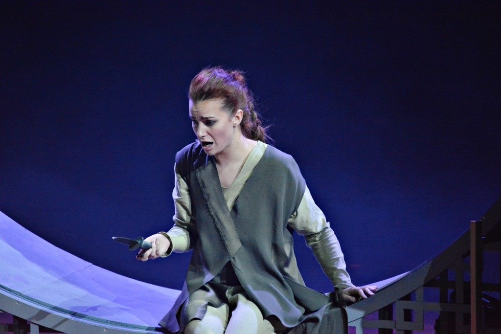 — Да, она появляется только во 2-м акте. И по сравнению с огромными ролями Ореста или Клитемнестры не так объёмна. Но там и сольная сцена, и дуэты, и ансамбли. Есть что попеть. Музыка сложная, но красивая, особенно хоровые фрагменты. Кроме того, Таддеуш на первой же сценической репетиции посмотрел на меня и придумал для Электры и в 1-м акте немую роль. Я должна была сидеть сбоку, на первом плане, и наблюдать за всеми наворотами сюжета — интригами и убийствами. Театральную кровь закупали канистрами, все натуралистично заливались ею, и она с трудом смывалась после, прямо как настоящая.