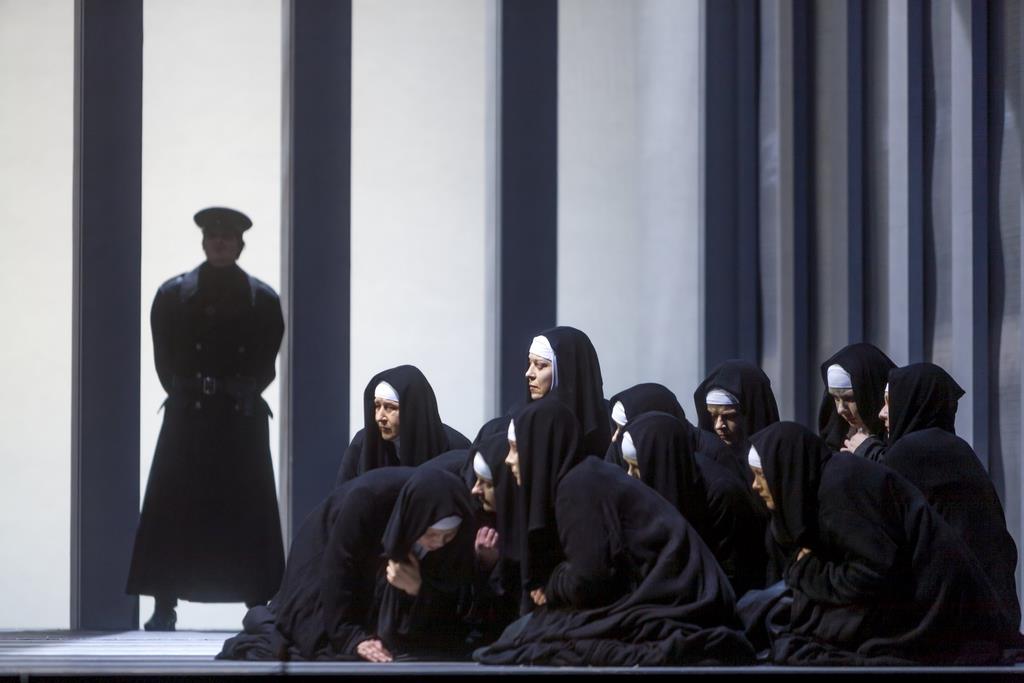 В лекции, традиционно предшествующей немецким оперным спектаклям, сказали, что в постановке Николауса Ленхоффа всё редуцировано к самому главному. Не менее традиционно, чем лекция, это значит – пустая серая сцена, шевалье де ла Форс в брючном костюме, офицеры в стиле между стереотипно нацистскими и чекистскими. К счастью, артистки всё сыграли своими голосами.