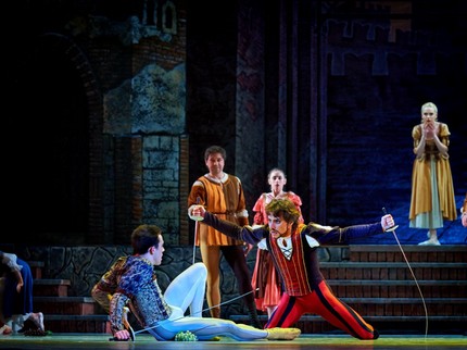 Натуралистично и зрелищно хореографами была поставлена развёрнутая контрапунктическая сцена боя на шпагах в первом акте (ход битвы изображается сменой пластических групп, пластических композиций, где немаловажное значение играют барельефные построения).