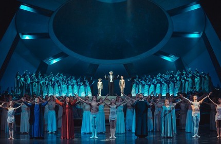 Это и размещение на середине сцены оркестра, а смешанного хора с солистами — по бокам сценического подиума. Это и череда солирующих пар, и выдвижение отдельным номером секстета исполнителей (трёх пар со сменным контрапунктирующим и унисонным построением танцевальных «линий»). Это схожесть и в плане сценографии — введения абриса круга, символизирующего круговорот мироздания и единение людей. Сходство сценических костюмов: обнажённый торс у танцовщиков и короткая туника, более напоминающая трико, у балерин, призванных подчеркнуть первозданную красоту и совершенство человеческого тела.