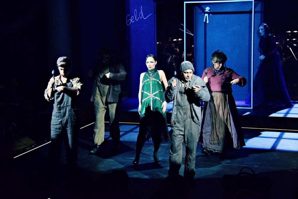 Больше напоминает сцену из оперы или оперетты, особенно если учесть голос Ларисы Костюк. Она обладает мощным, «мясистым» тембром меццо-сопрано, и низкий регистр звучит прямо-таки зловеще, но зачем такой угрожающий нажим, и главное — зачем столько вибрато в зонгах? В конце концов, есть же запись той самой Лотте Ленья на Youtube, и можно убедиться, что эстетика совершенно иная.