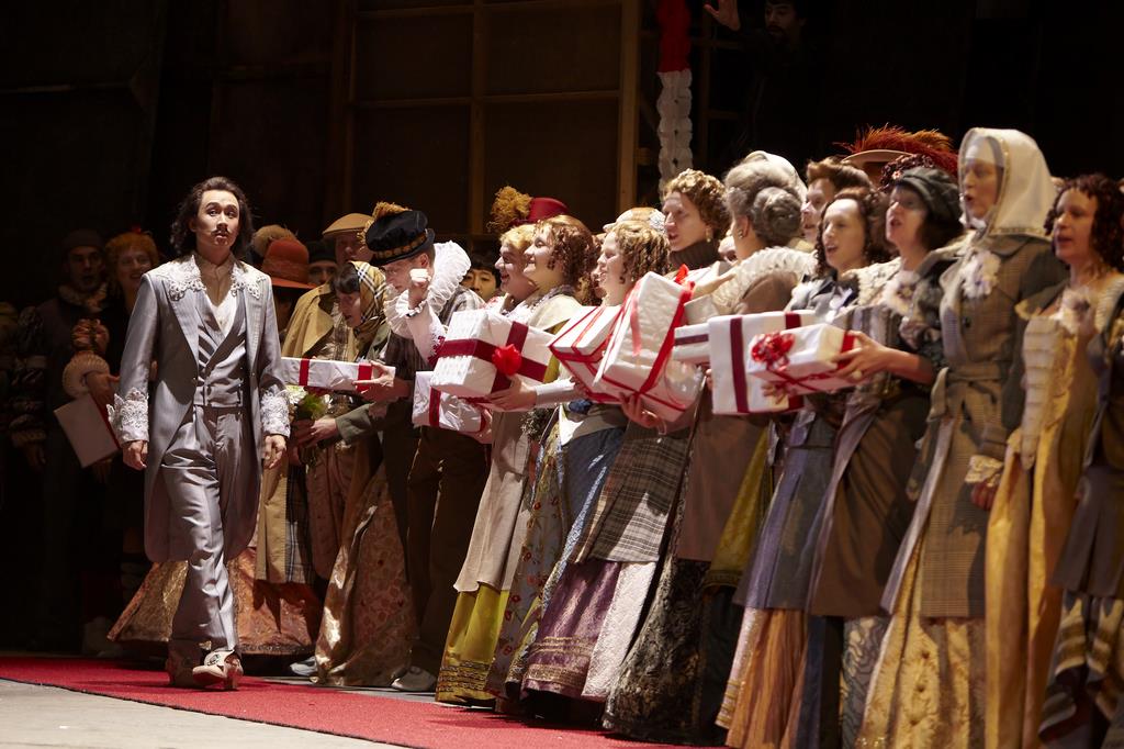 Лючия разрезала окровавленным кинжалом свадебный торт и угощала им гостей. Артуро (украинский тенор Олексий Пальчиков) она убила внутри массивной позолоченной кровати с красными занавесками. Алексей Богданчиков не давал забыть о том, что под скучным жилетом Энрико плавится с трудом сдерживаемая ярость. Белорус Александр Рославец (Раймондо) уговаривал Лючию выйти замуж за нелюбимого человека лёгким раскатистым басом так, что можно было действительно поверить и поддаться на эти уговоры.