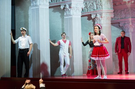 Нас словно приглашают на экзотический остров театральной зрелищности, где музыке Россини, несмотря на камерные размеры сцены и населенность постановки довольно большим количеством «фоновых» статистов, дышится легко и просторно. Впрочем, сценографический антураж с перспективой римских «псевдокоринфских» колонн и эскизной прорисовкой очертаний итальянского палаццо на исконную сюжетную локализацию в Италии всё же недвусмысленно намекает. Сей антураж – непонятно даже, экстерьер это или интерьер – выступает неизменным базисом всего спектакля: на протяжении двух его актов в точно заданной системе театральных координат бурлят страсти, разбиваются сердца и происходит «воспитание нравов».