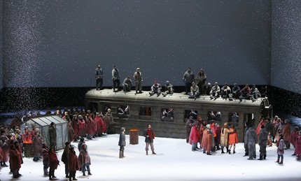 Однако, вернемся к спектаклю 15 июня. Безусловно, сильная его сторона – хоровые сцены, за исключением огрехов дикции, в остальном они очень понравились: чисто, выверено, монументально (хормейстер Валерий Борисов). Помимо пения, массовые сцены понравились и построениями массовки. А вот про организацию индивидуального взаимодействия того же сказать нельзя: если народная масса на пустой огромной сцене выглядела адекватно, то все более мелкие движения – просто тонули, да и ватники и пледы на артистах визуальной внятности жестов не способствуют.