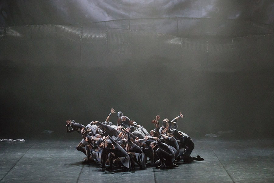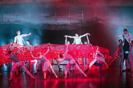 Яна Штангей (Ора) и Такатоши Мачияма (Орр) парили в любовных дуэтах (второй ярус сцены), открывая зрителям ощущение головокружительной высоты. А порой, словно приземляясь, присоединялись к героям, чутко оберегая их любовь. Штангей блеснула выразительно-жестовой пластикой танцевальных линий в своем сольном танце в ритме болеро. Абрис круга в этом номере ассоциируется с ограниченным пространством клетки — с замкнутым и обречённым миром, миром без выхода. И распятая фигура Оры — это распятие всего светлого, прежде всего, любви.