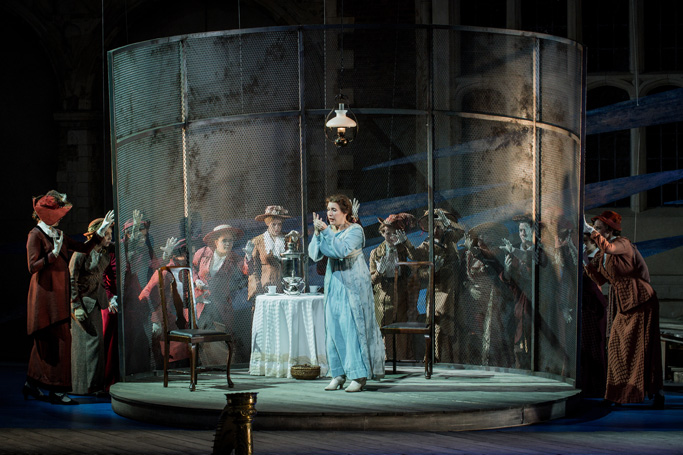 Задний фон «сцены» Holland Park Opera — фасад барского дома, будто перечёркнутый, ограниченный символическим забором, схематичными пейзажами Волги и реалистичной клеткой. В ней