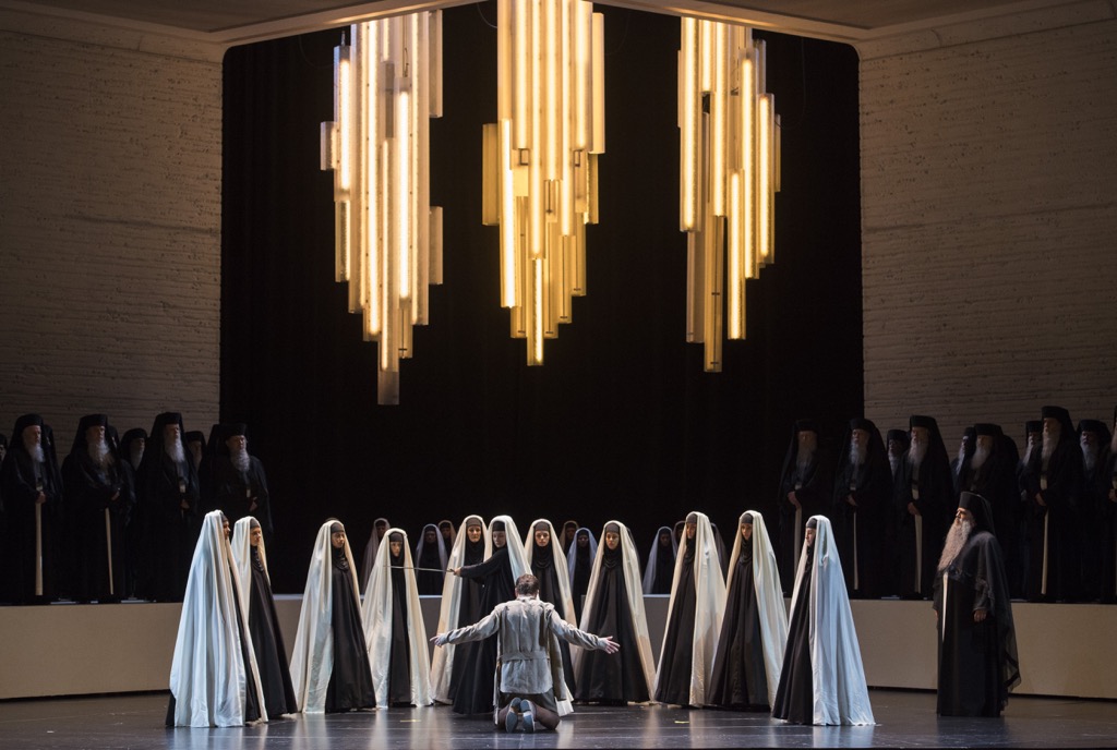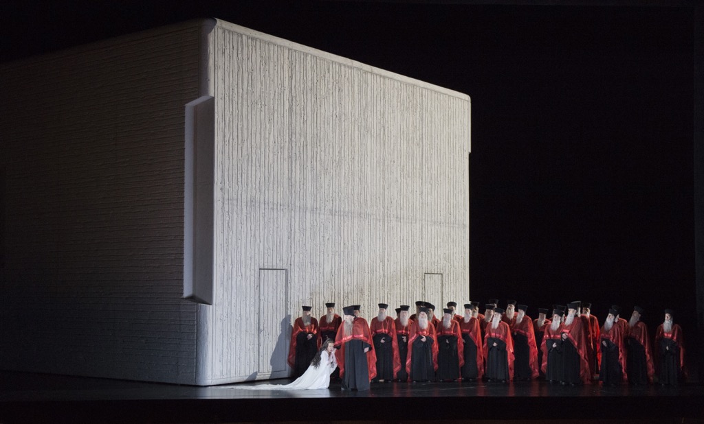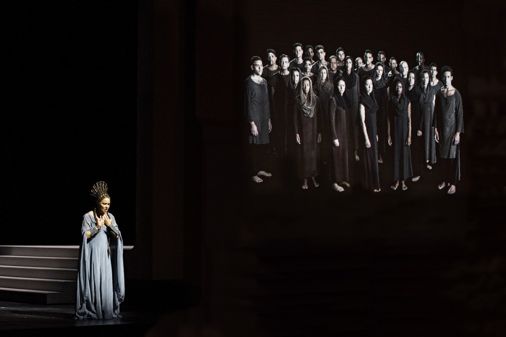 В «Аиде» Нешат нет экшна, и это, строго говоря, не совсем тот театр, где шевелятся. Певцы (особенно, певицы) в некотором роде предоставлены сами себе, а хор закован в статичные позы и в покрывала с рясами и балахонами. Минимум трафика по сцене. Но если вспомнить, что опера — это вроде бы как не балет и что в опере основной «экшн» растворён в музыке и в пении, то именно такая монотонно-статическая постановка, в которой народные массы не ходят, а ездят (точнее, крутятся вместе с круглой подвижной частью сценического планшета), и есть идеальное представление оперы как жанра.