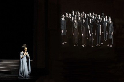 Что показала на сцене автор нашумевшей фотоколлекции «Женщины востока» Ширин Нешат? Пара видеоинсталляций (оператор — Мартин Гшлахт) на «каменных» торцах раскрывающейся кубической капсулы как символа моральных рамок, в которых в финале благополучно гибнут главные герои (сценография Кристиана Шмидта).